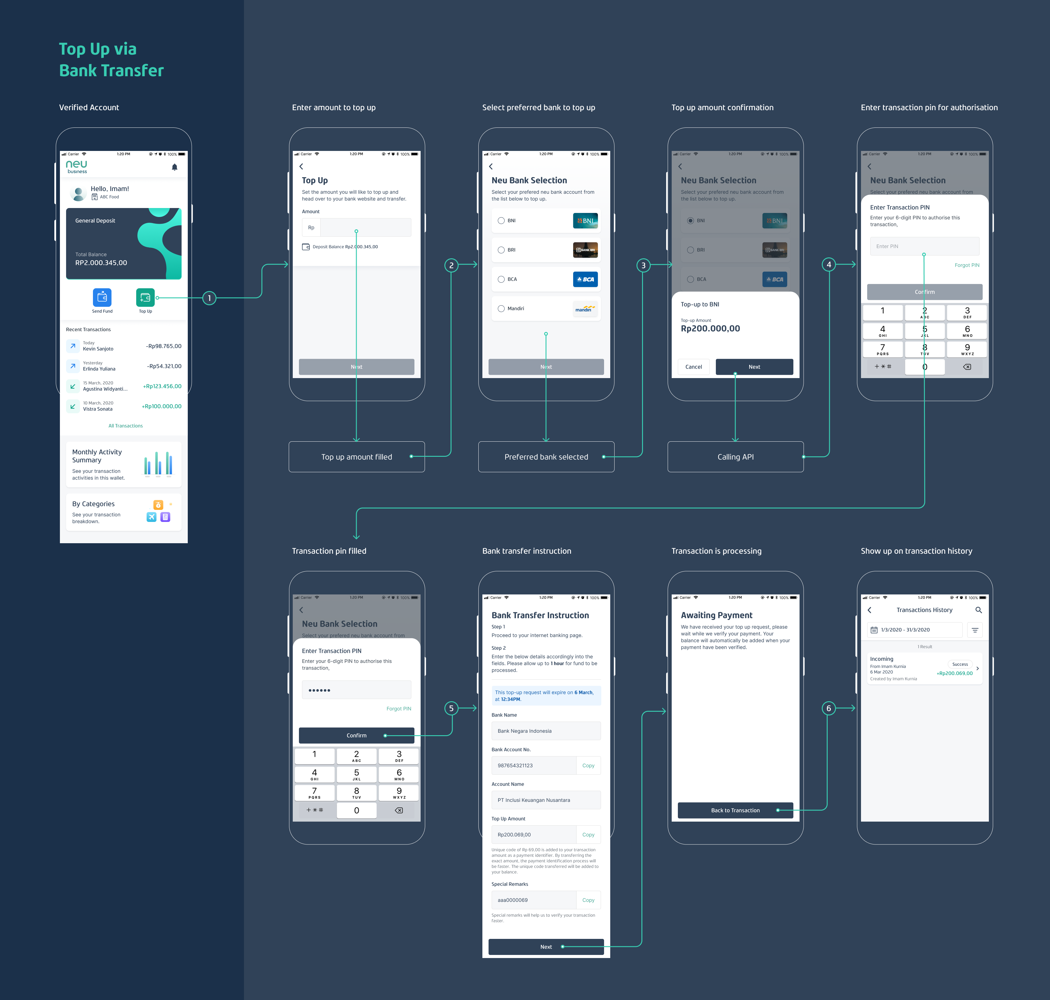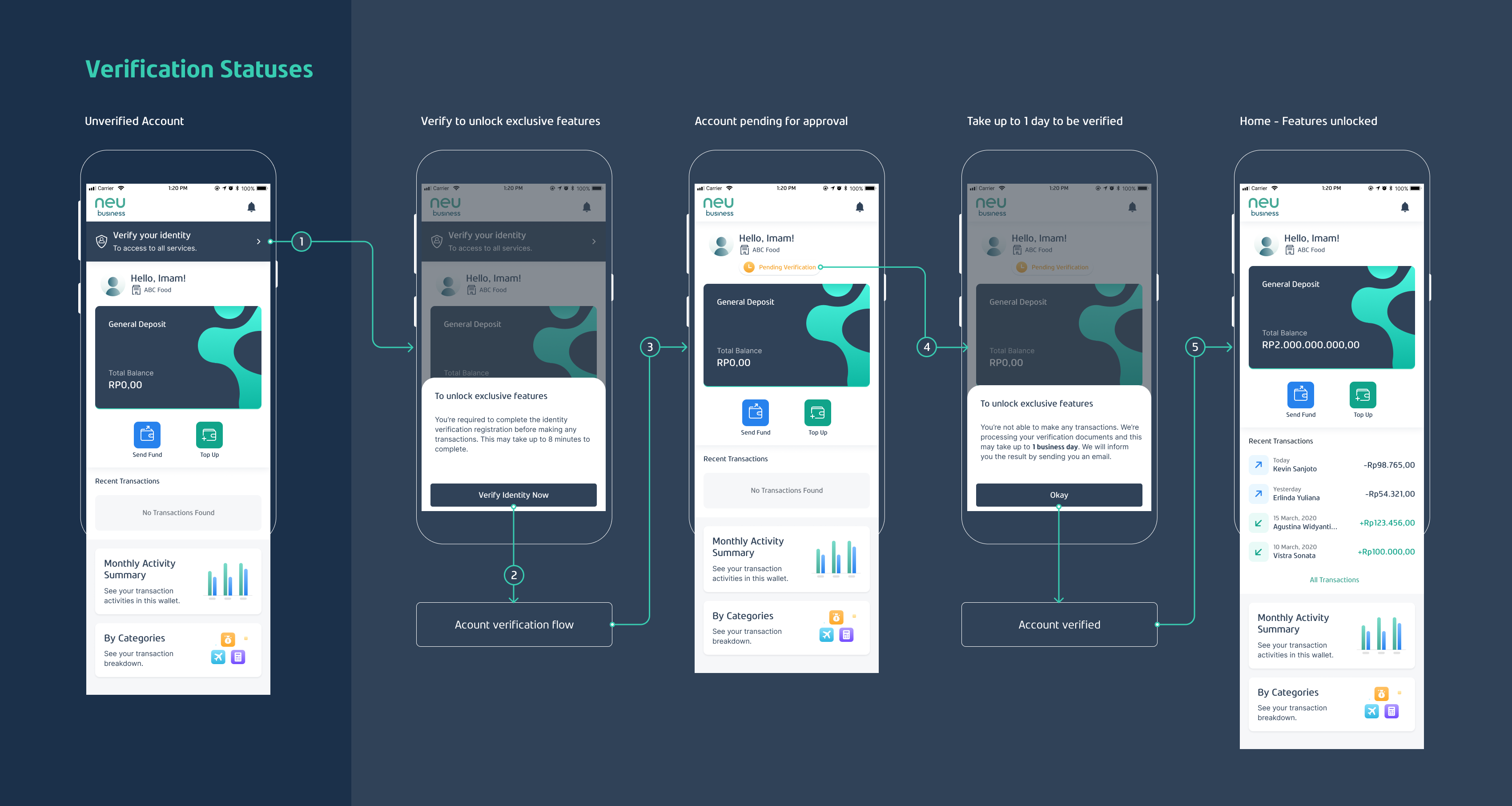The proposed concept illustrates the business users' journey, encompassing account verification, financial health tracking, topping up, and sending funds in bulk.